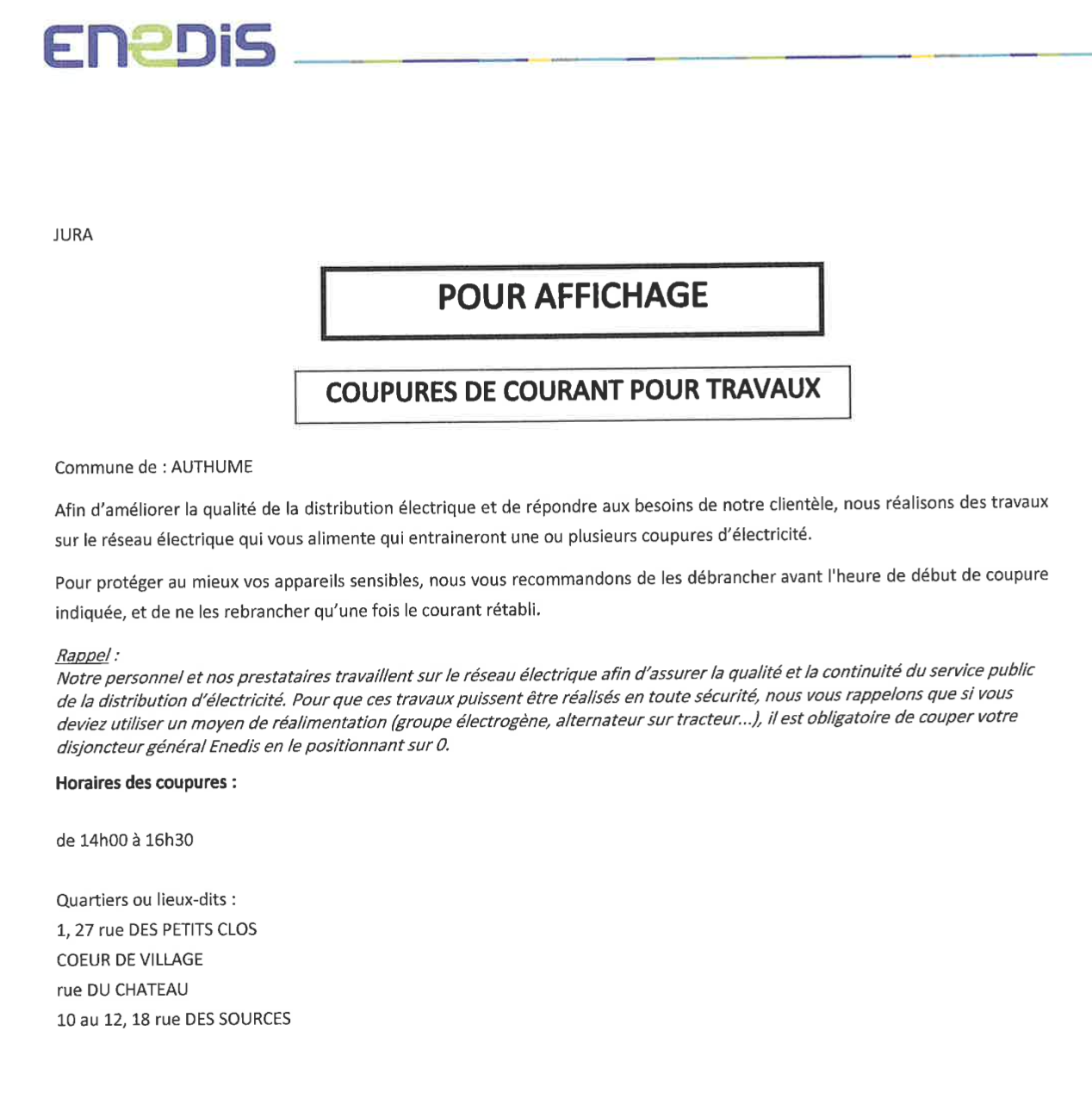 Enedis nous informe d'une coupure d'électricité le mercredi 3 décembre 2025 entre 14H00 et 16h30 pour