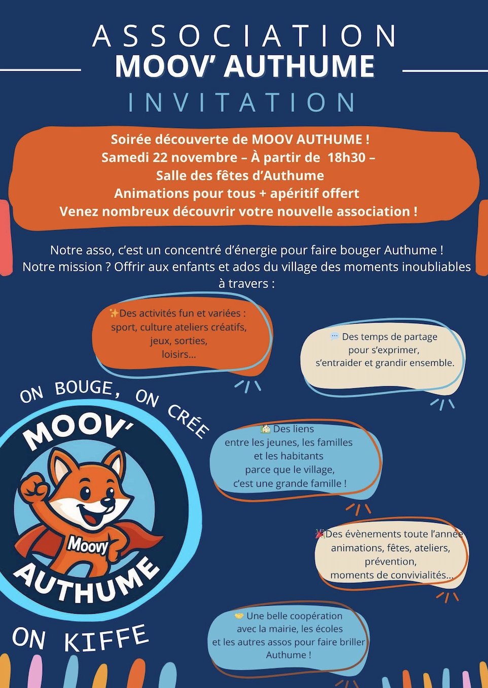 L'association Moov'Authume vous invite à sa soirée découverte le samedi 22 novembre à partir de 18h30 à la salle des fêtes d'Authume.
