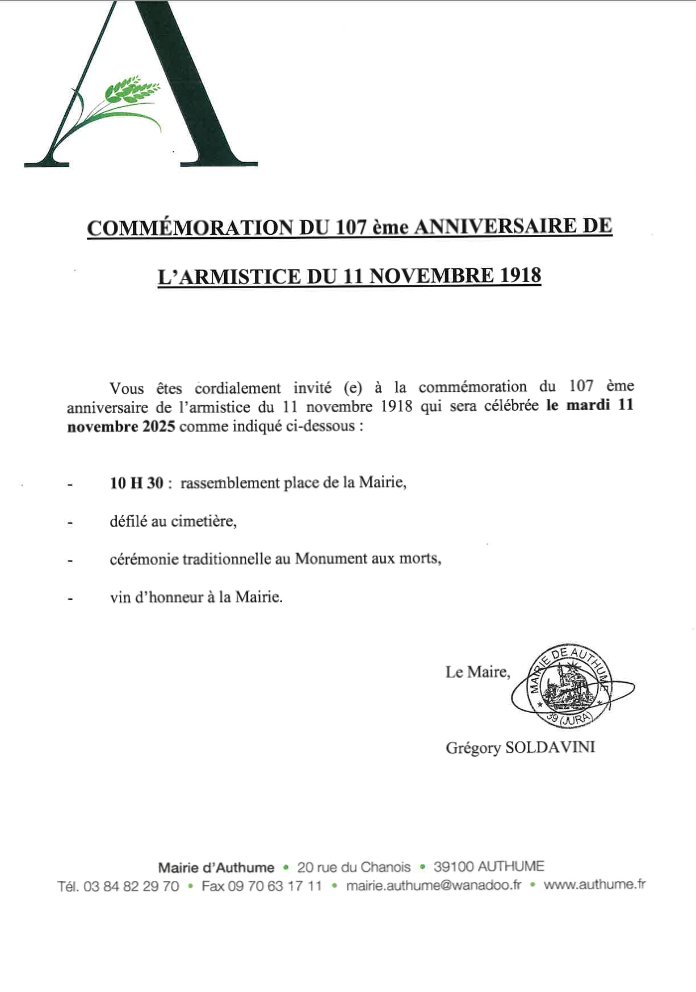 La commémoration du 107 ème anniversaire de l’armistice du 11 novembre 1918 sera célébrée aujourd'hui sur la commune d'Authume.